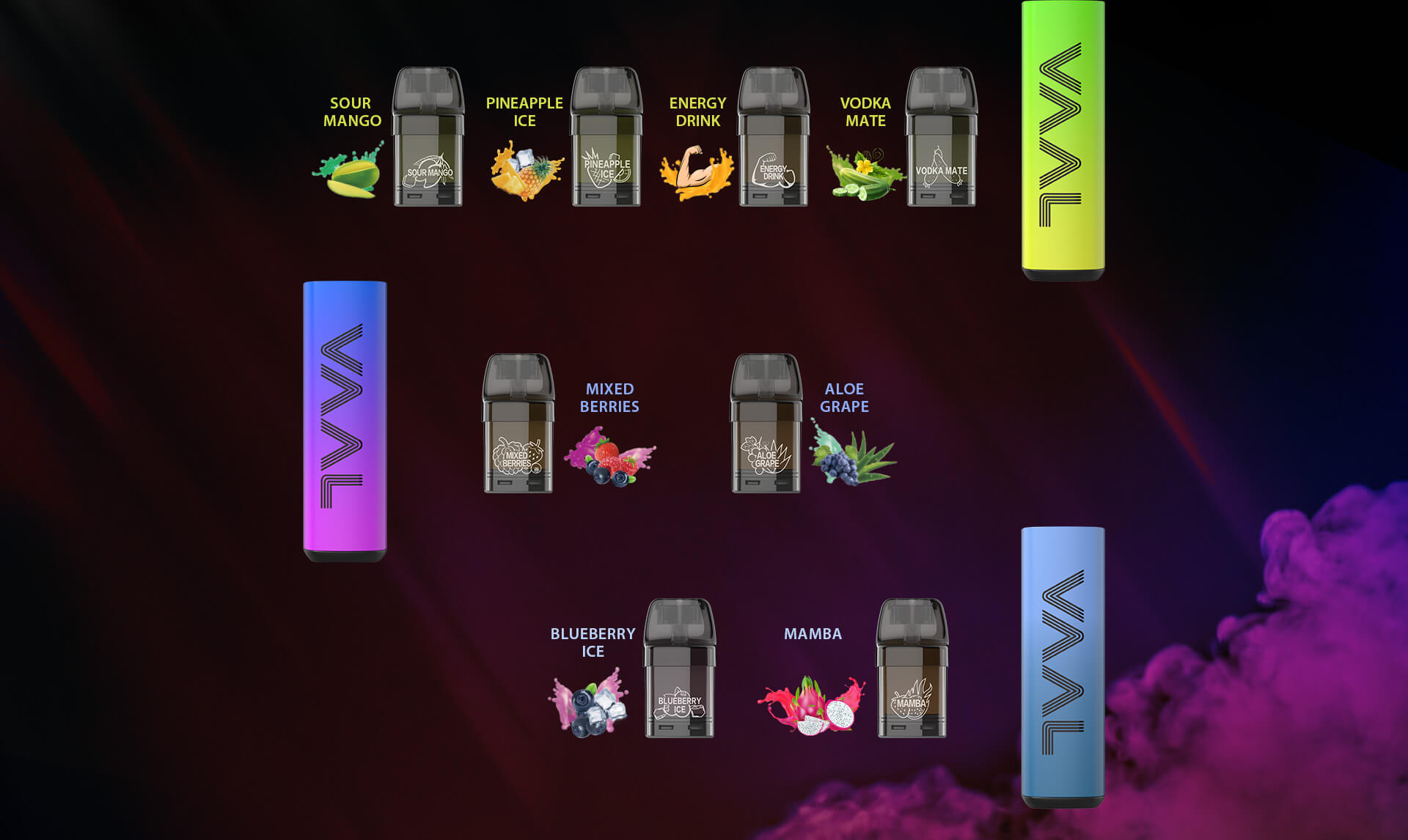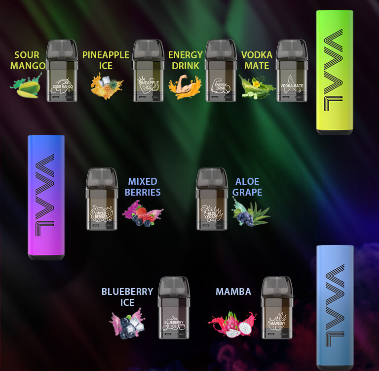 The Vaal CQ3300 vape kits are available in 20 flavors which includes Classic, Guava Granadilla Ice, Pina Colada, Ice Skittles, Lush Ice, Orange Ice, Fresh Crisp, Gummy Candy, Double Apple, Strawberry Ice Cream, Strawberry Kiwi, Peach Mango, Sour Mango, Pineapple Ice, Energy Drink, Vodka Mate, Mixed Berries, Aloe Grape, Blueberry Ice and Mamba.