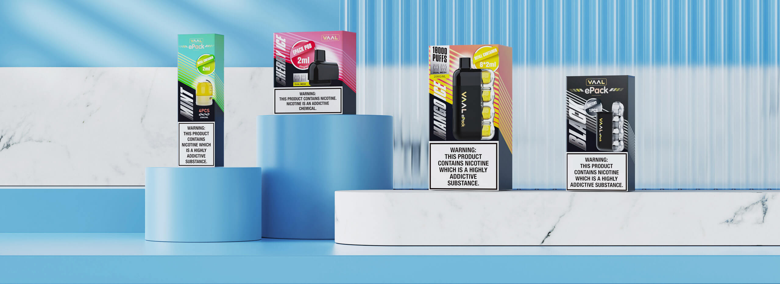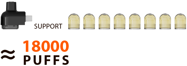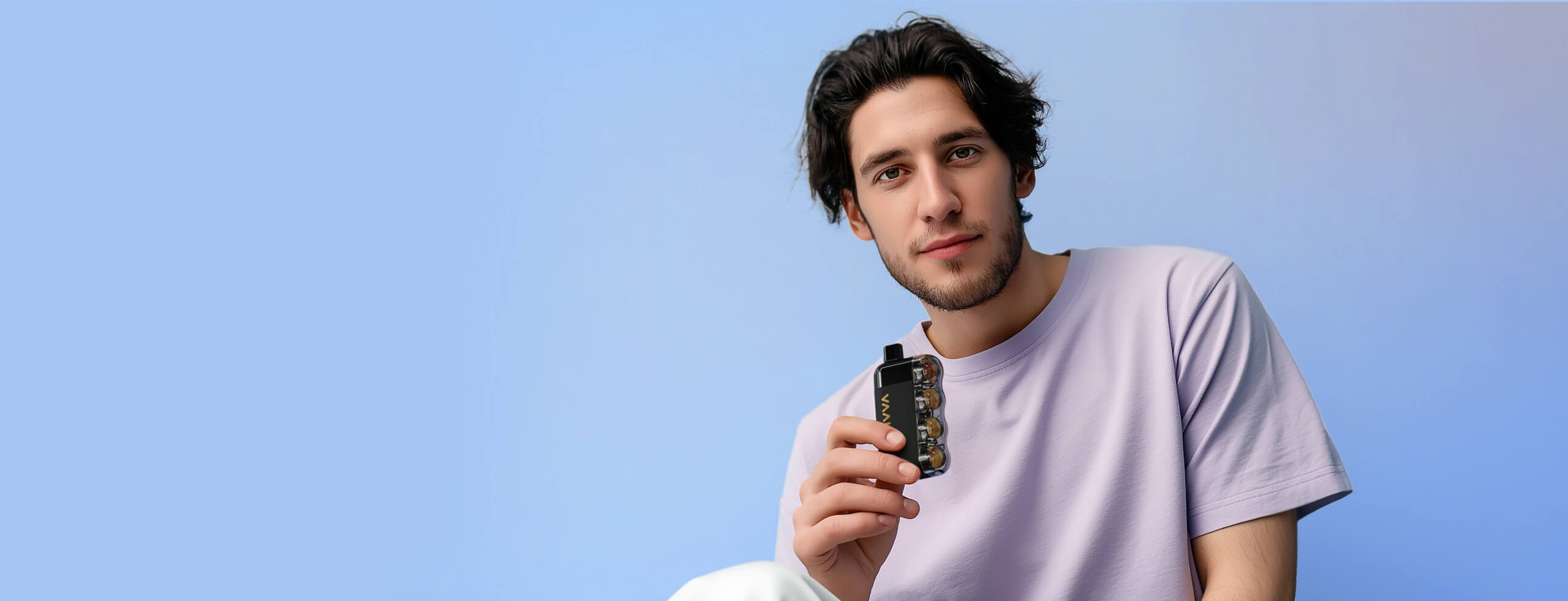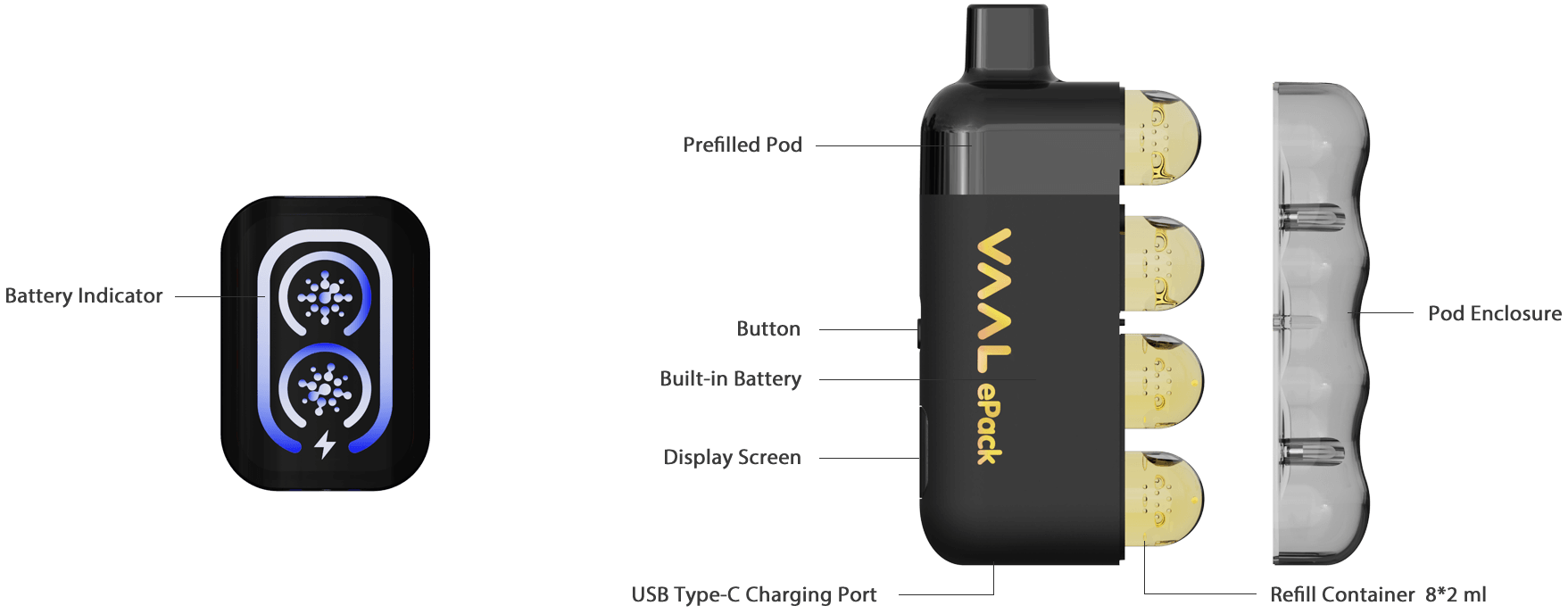 The VAAL ePack includes one prefilled 2ml pod and eight 2ml refill containers, delivering up to 18,000 puffs. When a pod runs out, simply open the magnetic case and twist in a new refill container. Powered by advanced DUOCORE Technology and a dual 1.2Ωmesh coil, it supports both MTL and DML modes for a personalized vaping experience. The built-in 1100mAh battery ensures all-day performance and fully recharges in under an hour via USB-C.